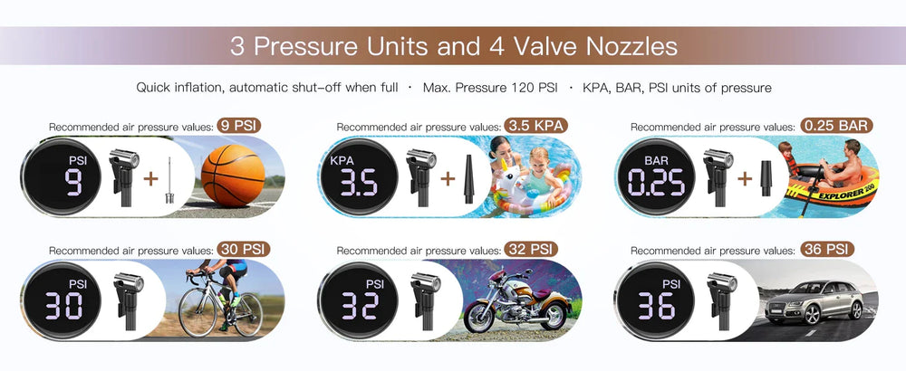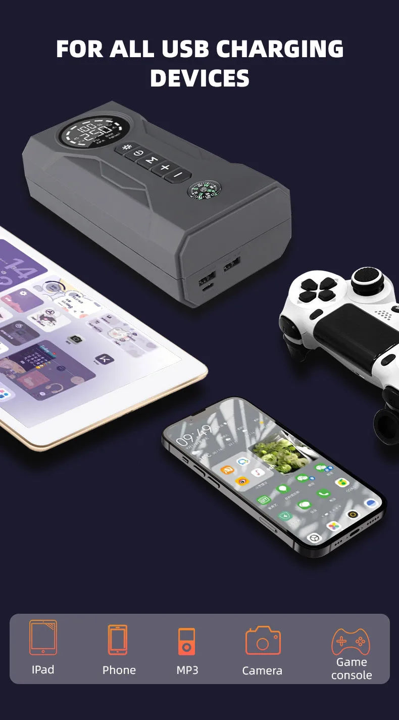 Compresor de Aire Integrado: Infla neumáticos de auto, moto o pelotas con una presión de hasta 150 PSI.